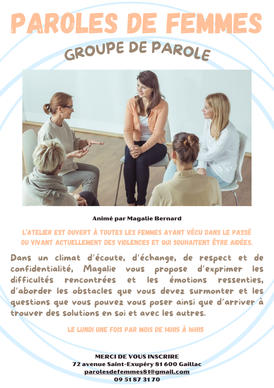 - Il se déroule à l’association Paroles de Femmes de Gaillac au 72 avenue Saint-Exupéry.